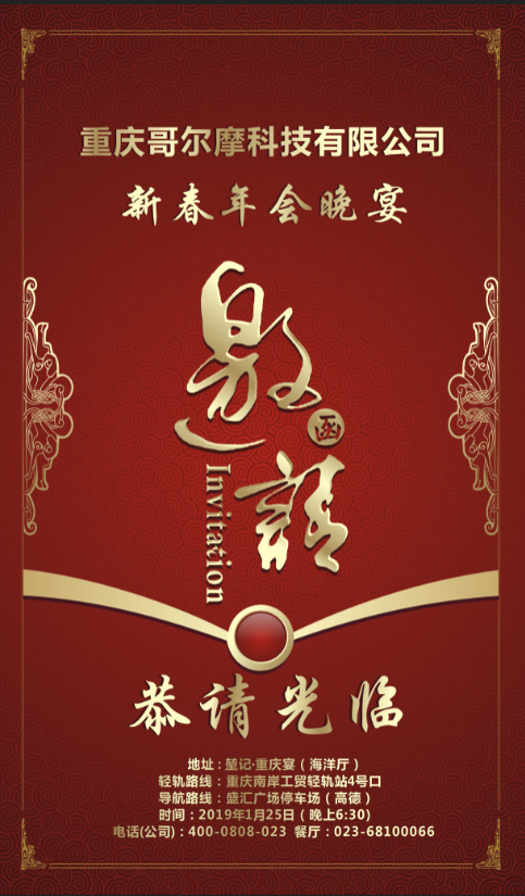 前進(jìn)的路上總是充滿艱辛與坎坷。有幸的是,有緣與您相識(shí)!您的鼓勵(lì)、信任、支持,讓我們充滿信心,且不斷成長(zhǎng)。我們需要更真實(shí),也希望得到更多的寶貴意見。秉承“交流、合作、共贏”的理念,誠(chéng)邀您參加重慶哥爾摩科技有限公司2019新春年會(huì)!