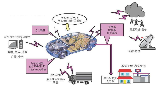 隨著眾多汽車電子產(chǎn)品數(shù)量的增加,工作頻率的提高,功率的增大,使得汽車工作環(huán)境中充斥著電磁波,導(dǎo)致電磁干擾問題日益突出,輕則影響汽車電子設(shè)備的正常工作,造成駕駛不便,重則損壞相應(yīng)的電器元件,危及車乘人員的生命安全。電子技術(shù)在汽車上的大量應(yīng)用,對汽車的經(jīng)濟性、安全性、舒適性等方面起著非常重要的作用。汽車電子設(shè)備工作所構(gòu)成的電磁環(huán)境具有復(fù)雜性和多變性的特點,這意味著車載系統(tǒng)所受到的干擾來源比較廣泛。按照電磁干擾的來源分類,可分為靜電干擾、車外干擾、車內(nèi)干擾。
