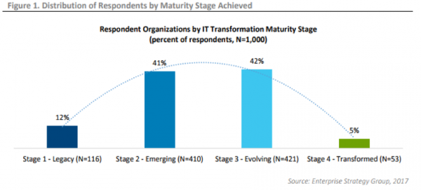 一個郵箱升級案例,折射出企業(yè)數(shù)字化轉(zhuǎn)型的復(fù)雜度。這也就難怪,在ESG企業(yè)戰(zhàn)略集團(tuán)2017年4月發(fā)布的報告顯示,調(diào)查了全球1000家企業(yè),發(fā)現(xiàn)轉(zhuǎn)型得比較成功的企業(yè)(階段4)只有5%。多數(shù)企業(yè)處于第二、第三階段。