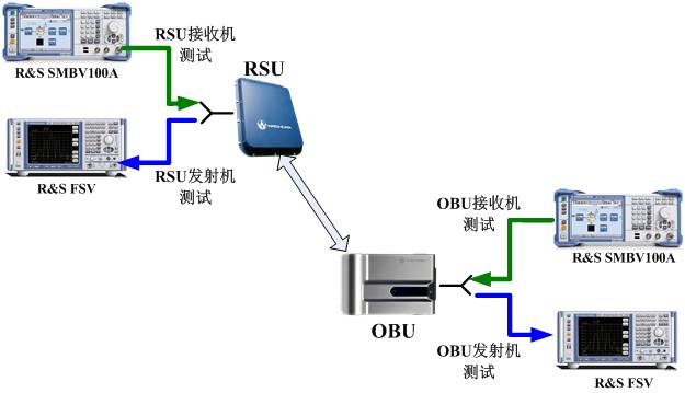 依據(jù)GB/T 20851.5-2007標準,主要是針對RSU和OBU物理層參數(shù)的測試,包括 RSU發(fā)射機測試,RSU接收機測試,OBU 發(fā)射機測試和 OBU 接收機測試共4 類。其測試框圖如下: