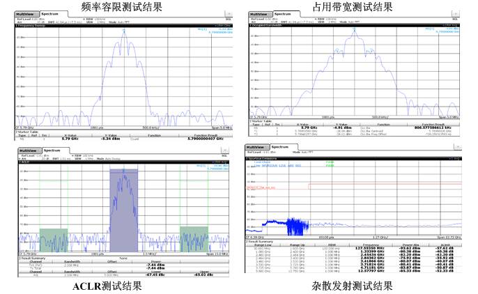 射頻測試主要包括:頻率、頻率容限、占用帶寬、鄰道功率及雜散發(fā)射等指標,可以采用FSV的基本射頻功能完成測試,其測試結果如下: