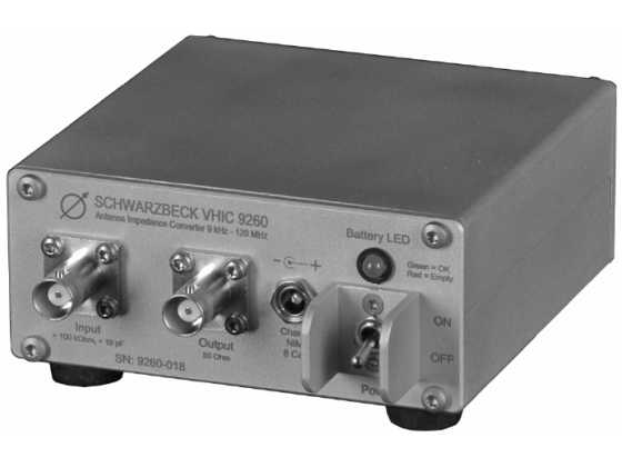 低噪聲阻抗匹配設(shè)備VHIC 9260具有小電容高阻抗輸入和50歐姆輸出,可和普通EMI接收機(jī)或頻譜分析儀配套,測(cè)量汽車(chē)天線的輻射發(fā)射,頻率范圍9kHz-120MHz。VHIC 9260的信號(hào)來(lái)源可以是拉桿天線或者容性電壓探頭,良好的線性能確保按照CISPR 25規(guī)定進(jìn)行精確測(cè)量。VHIC 9260有2個(gè)BNC連接器,分別為RF輸入和RF輸出。