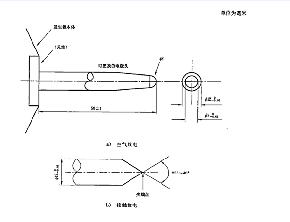 放電電極的圓形放電頭應盡可能塊地接近并觸及被測設備(不能造成機械損傷)。每次放電之后,應將靜電放電發(fā)生器的放電電極從被測設備移開,然后重新觸發(fā)發(fā)生器,進行新的單次放電,這個程序應當重復至放電完成為止。在空氣放電試驗的情況下,用作接觸放電的放電開關應當閉合。
