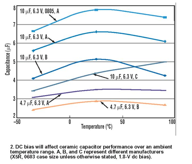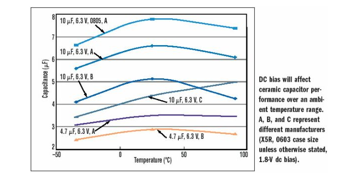 那么,系統(tǒng)設(shè)計人員還需要了解除陶瓷電容之外的東西嗎?絕對需要。例如,在選擇陶瓷電容的電容值及其外殼尺寸之余,必須考慮到它的直流偏置效應(yīng)。電容選擇不正確可能對系統(tǒng)的穩(wěn)定性造成嚴(yán)重破壞。直流偏置效應(yīng)通常出現(xiàn)在鐵電電解質(zhì)(2類)電容中,如X5R、X7R、及Y5V類電容。