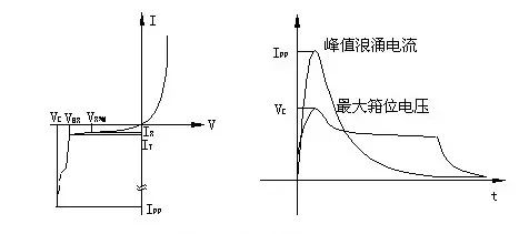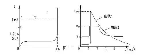 如果用圖示儀觀察TVS的特性,就可得到圖1中左圖所示的波形。如果單就這個(gè)曲線來(lái)看,TVS管和普通穩(wěn)壓管的擊穿特性沒(méi)有什么區(qū)別,為典型的PN結(jié)雪崩器件。