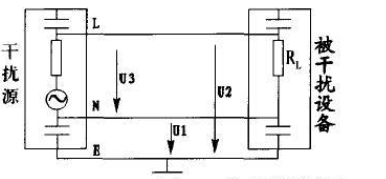 舉例說明,如上面圖中所示,L、N為載流導(dǎo)線,E作為地線。U3電壓為差模干擾信號對應(yīng)的電壓,而U1和U2是共模干擾信號對應(yīng)的電壓。
