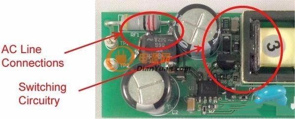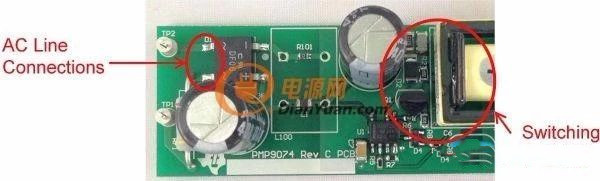 圖1是這些非計劃中電容的一個實例。圖中的右側(cè)是一個垂直安裝的FET,所帶的開關(guān)節(jié)點與鉗位電路延伸至了圖片的頂部。輸入連接從左側(cè)進入,到達距漏極連接1cm以內(nèi)的位置。這就是故障點,在這里FET的開關(guān)電壓波形可以繞過EMI濾波器耦合至輸入。