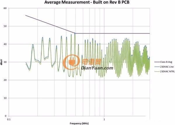 圖4是修改后的效果圖。我們在故障點位置為EMI規(guī)范獲得了大約6dB的裕量。此外,我們還顯著減少了總體EMI簽名。所有這些改善都僅僅是因為布局的調(diào)整,并未改變電路。如果您的電路具有高電壓開關(guān)并使用了屏蔽距離,您需要非常小心地對其進行控制。