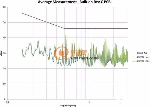 注意,漏極連接與輸入引線之間有一些由輸入電容器提供的屏蔽。該電容器的外殼連接至主接地,可為共模電流提供返回主接地的路徑。如圖2所示,這個微小的電容會導(dǎo)致電源EMI簽名超出規(guī)范要求。