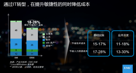 EMC公司自己的IT,也率先邁向轉(zhuǎn)型之路,為幫助客戶轉(zhuǎn)型積累經(jīng)驗(yàn)。例如,下面這些數(shù)據(jù)就來自EMC自身IT轉(zhuǎn)型的總結(jié)。