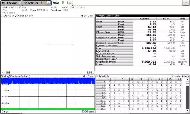 在數(shù)據(jù)率不大的情況下,采用ASK調制方式可以滿足通信傳輸?shù)男枰?。且信號占用帶寬小,調制和解調的電路比較簡單,容易實現(xiàn)??梢圆捎肍SV-K70VSA任意矢量分析軟件,對ASK信號進行解調,同時可以得到調制系數(shù)和調制速率的測試結果,如下: