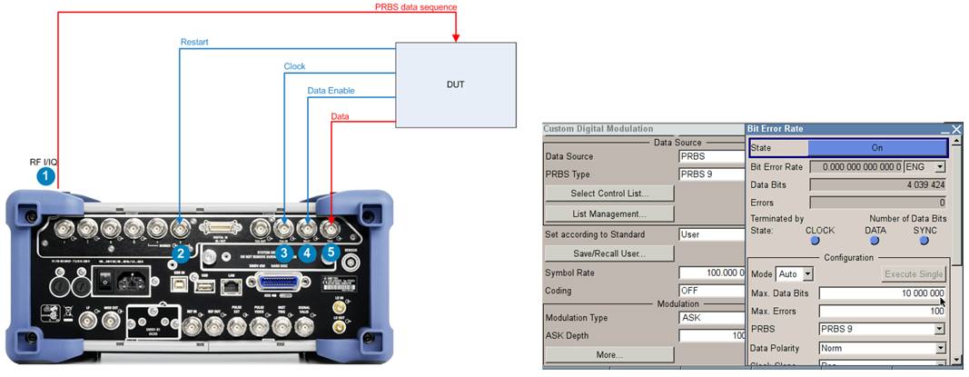 接收靈敏度是指OBU能夠正確接收小信號的能力,即:滿足規(guī)定誤碼率情況下,能夠接收最小信號功率。國標規(guī)定接收靈敏度要高于喚醒靈敏度,這樣OBU被喚醒后,即使接收的信號功率發(fā)生波動,也不會造成通信中斷,保證交易穩(wěn)定性。接收靈敏度并非越高越好,容易引入更多的干擾。通過矢量信號源SMBV100A選件,可以通過Data List和Control List進行FM0編碼數(shù)據(jù)的導入,完成接收靈敏度測試。關于接收機誤碼率測試,可以使用SMBV100A-K80來完成,具體的測試框圖如下: